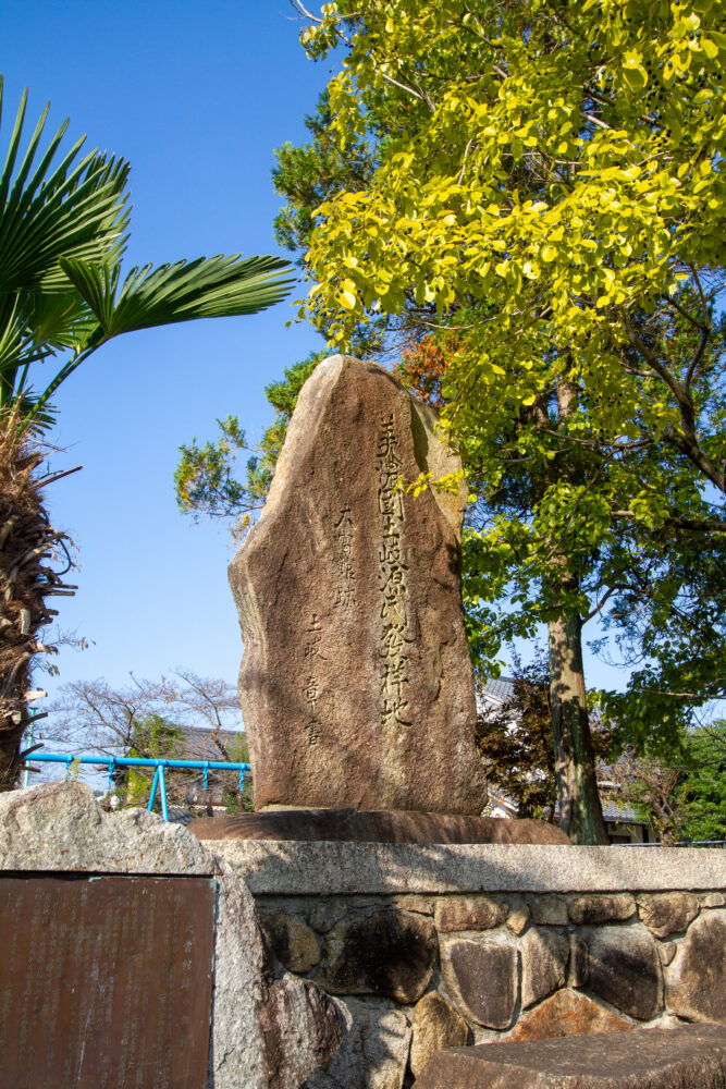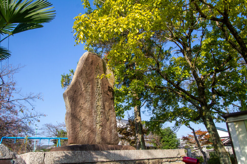 都市計画などの影響で当時の面影は少なくなっていますが、一基の標柱と一本の大きな樫(かし)の木が残されており、そこが館跡の目印となっています。